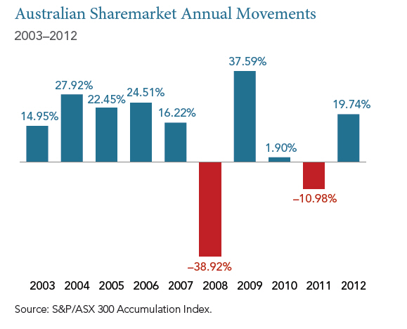 The above chart tracks the performance of the Australian share market over 2012 against some of the major news events of the year. These headlines are not offered to explain market returns. Instead, they serve as a reminder that investors should view daily news events from a longer-term perspective, and avoid making investment decisions based solely on the news.