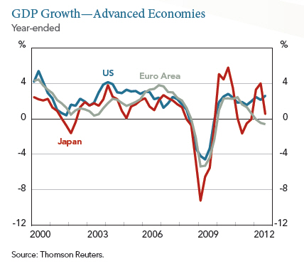 While Europe struggled with recession and high unemployment, the US economy showed evidence of upward momentum through the year. Meanwhile, China showed signs of a mild recovery toward the end of 2012. In Japan the newly re-elected Liberal Democratic Party came to power promising renewed fiscal and monetary policy stimulus to boost growth.